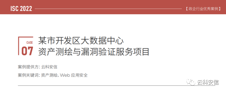 凭借在资产测绘与Web应用安全方面的技术优势及突出应用价值,云科安信某市开发区大数据中心资产测绘与漏洞验证服务项目经过海选、线上答辩及专家评审,最终成功入选并获评为ISC 2022十年网络安全优秀案例。