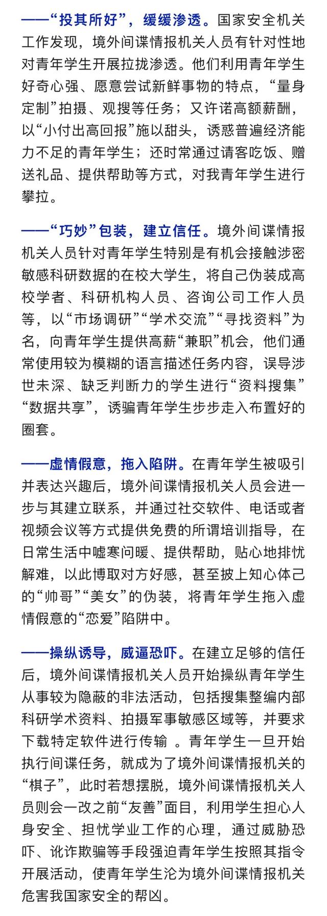 近年来,境外间谍情报机关瞄准我青年学生群体,以求职兼职、网络交友等为“噱头”,拉拢、利诱、胁迫我个别青年学生为其从事涉密资料搜集等间谍活动及其他违法行为,给我国家安全带来威胁。相关案例警示我们,要当心“私人定制”的高薪“兼职”陷阱,切勿踏入境外间谍情报机关的窃密圈套。